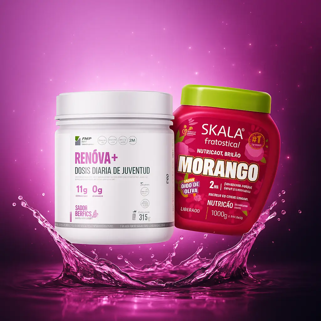 Renôva+ actúa desde el interior, aportando nutrientes esenciales que fortalecen la fibra capilar, favorecen el crecimiento y mejoran la resistencia de tu cabello frente a la caída y el quiebre. Por su parte, Skala Morango, con su fórmula enriquecida con aceite de oliva y extracto de fresa, hidrata profundamente, controla el frizz y devuelve el brillo natural a cada hebra.